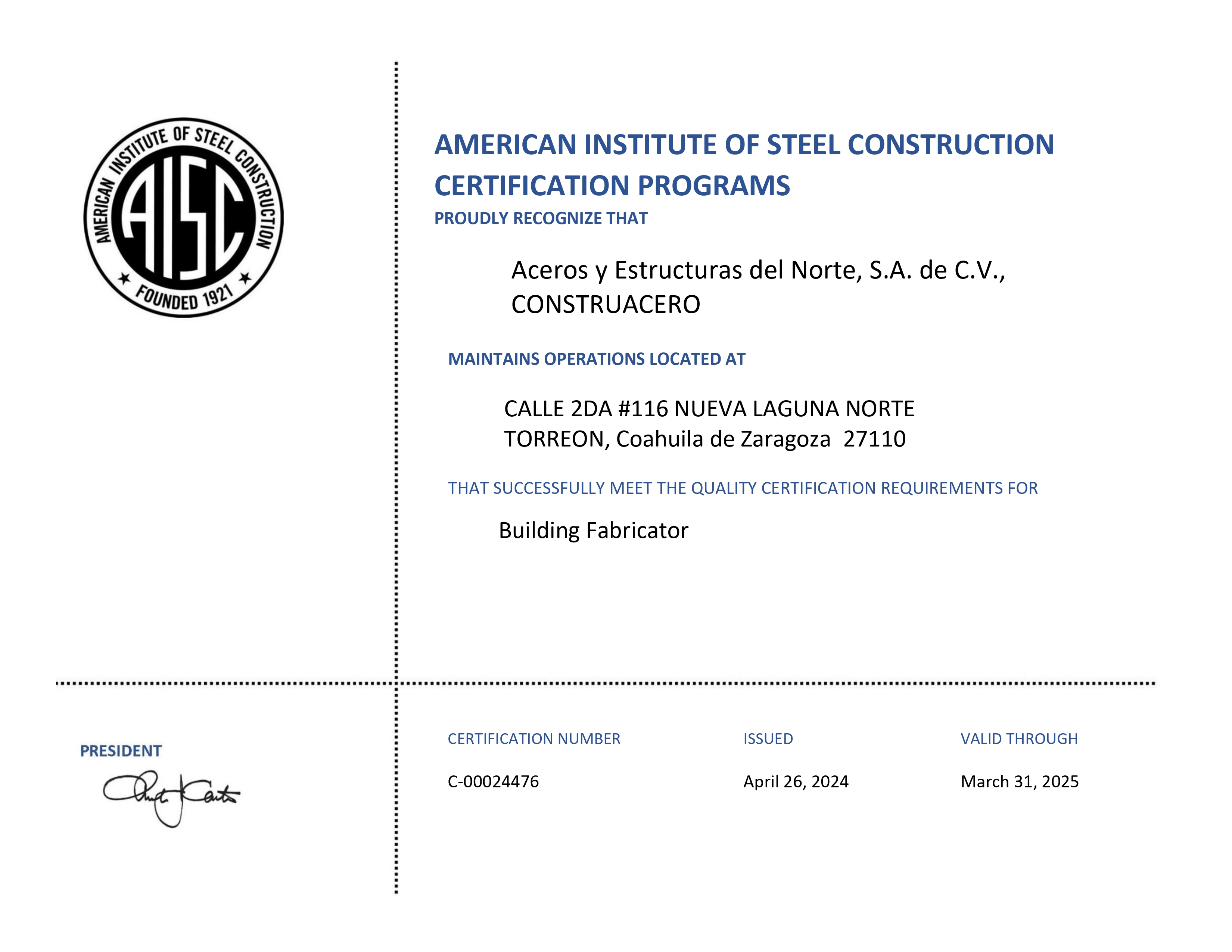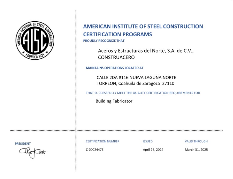 La certificación AISC (American Institute of Steel Construction) es un programa de certificación voluntario que evalúa y asegura la calidad y la competencia de las empresas que se dedican a la fabricación, diseño y construcción de estructuras de acero en Estados Unidos.